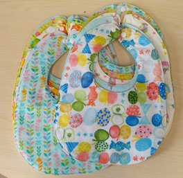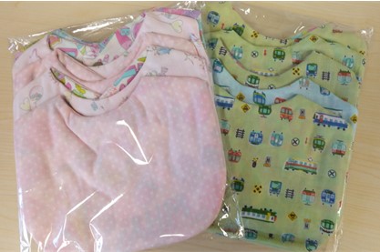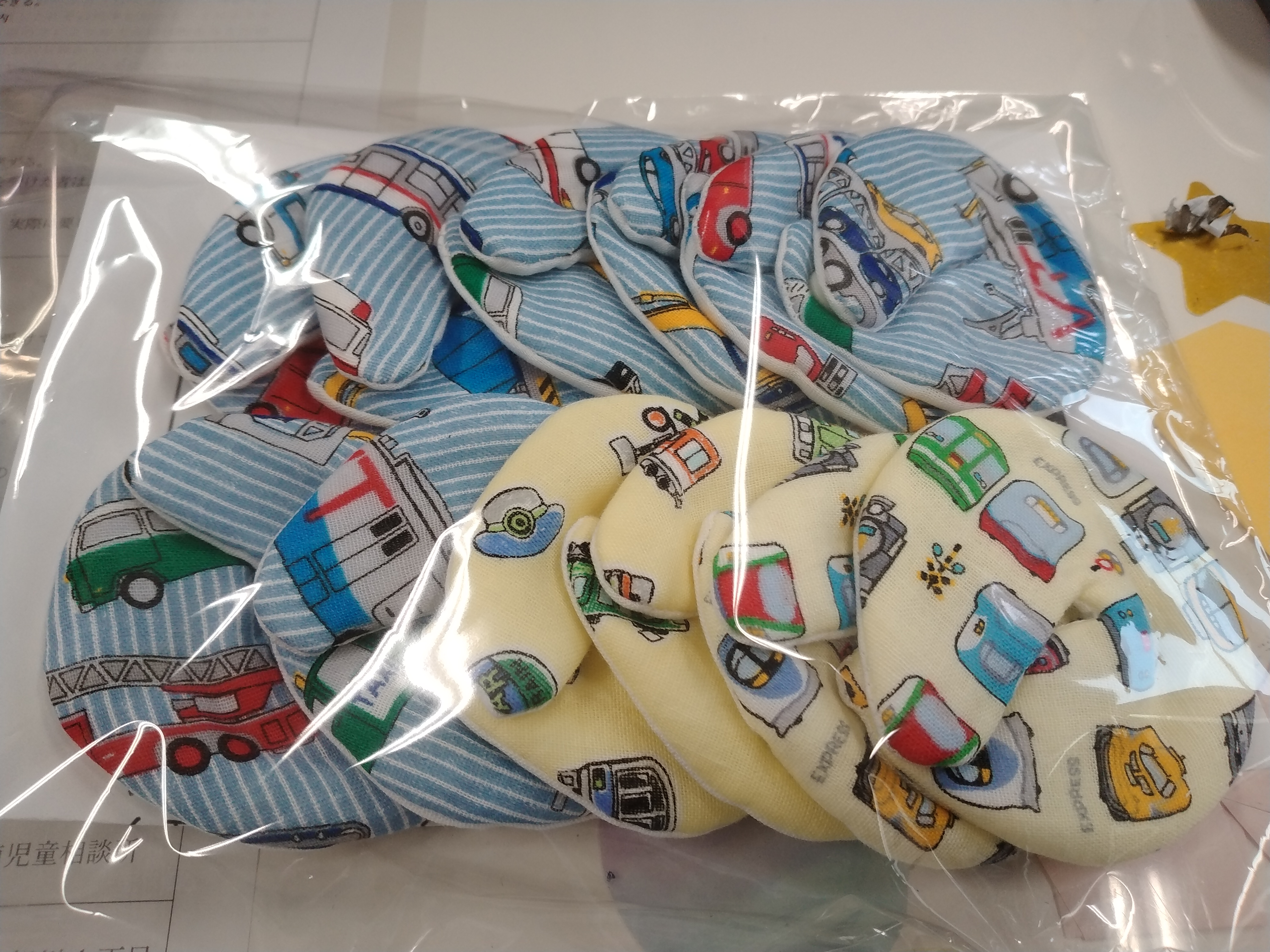 手作りスタイプロジェクトの中川様より、子どもたちへ手作りスタイを10枚いただきました。