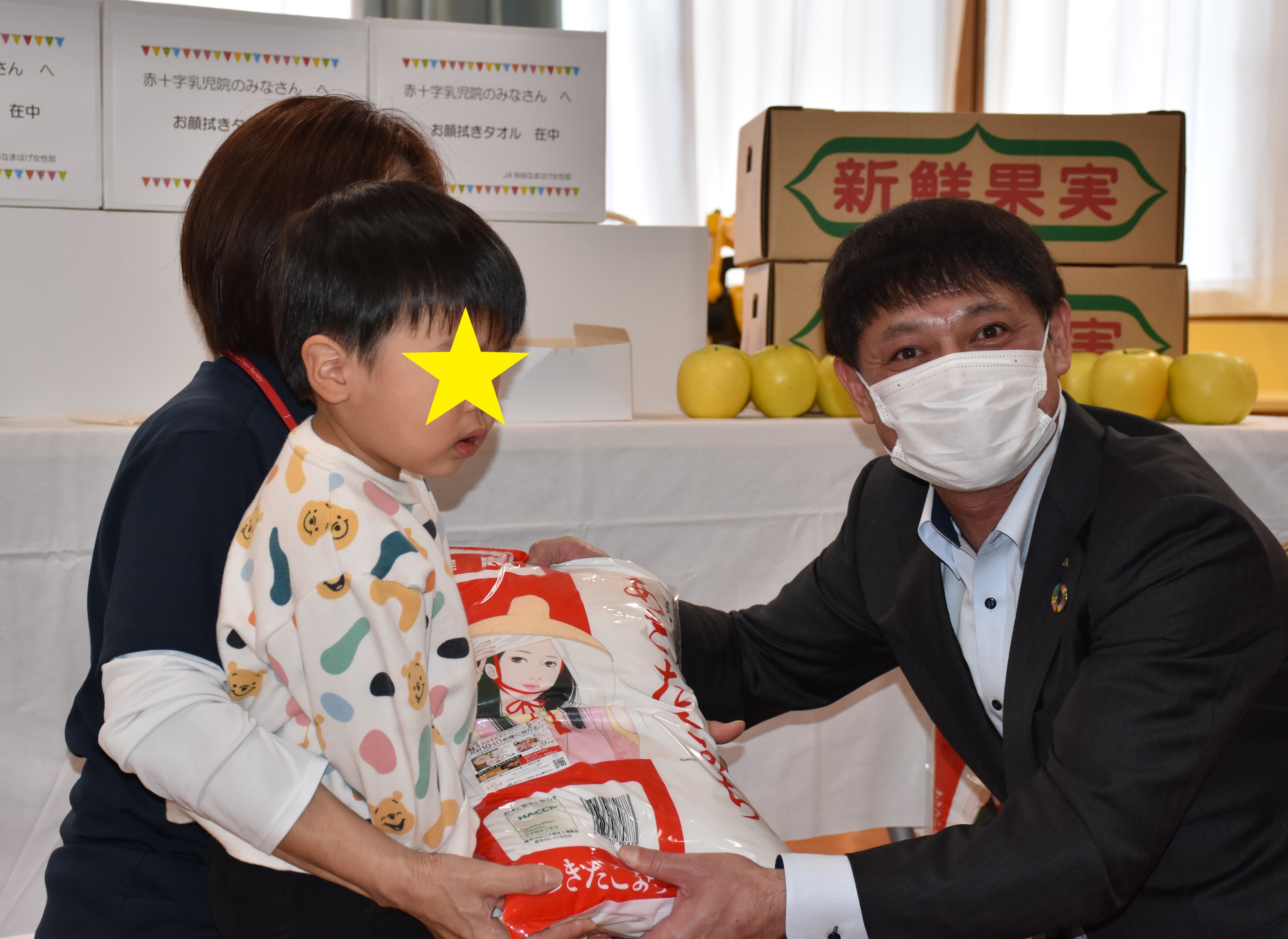 ○JA秋田なまはげ様より、今年も子どもたちへ美味しい新米200kgとりんご(シナノゴールド2箱)とクッキー。そして、女性部の皆様からは、手作り顔拭きタオル210枚、フェイスタオル160枚。たくさんご寄付いただきました。