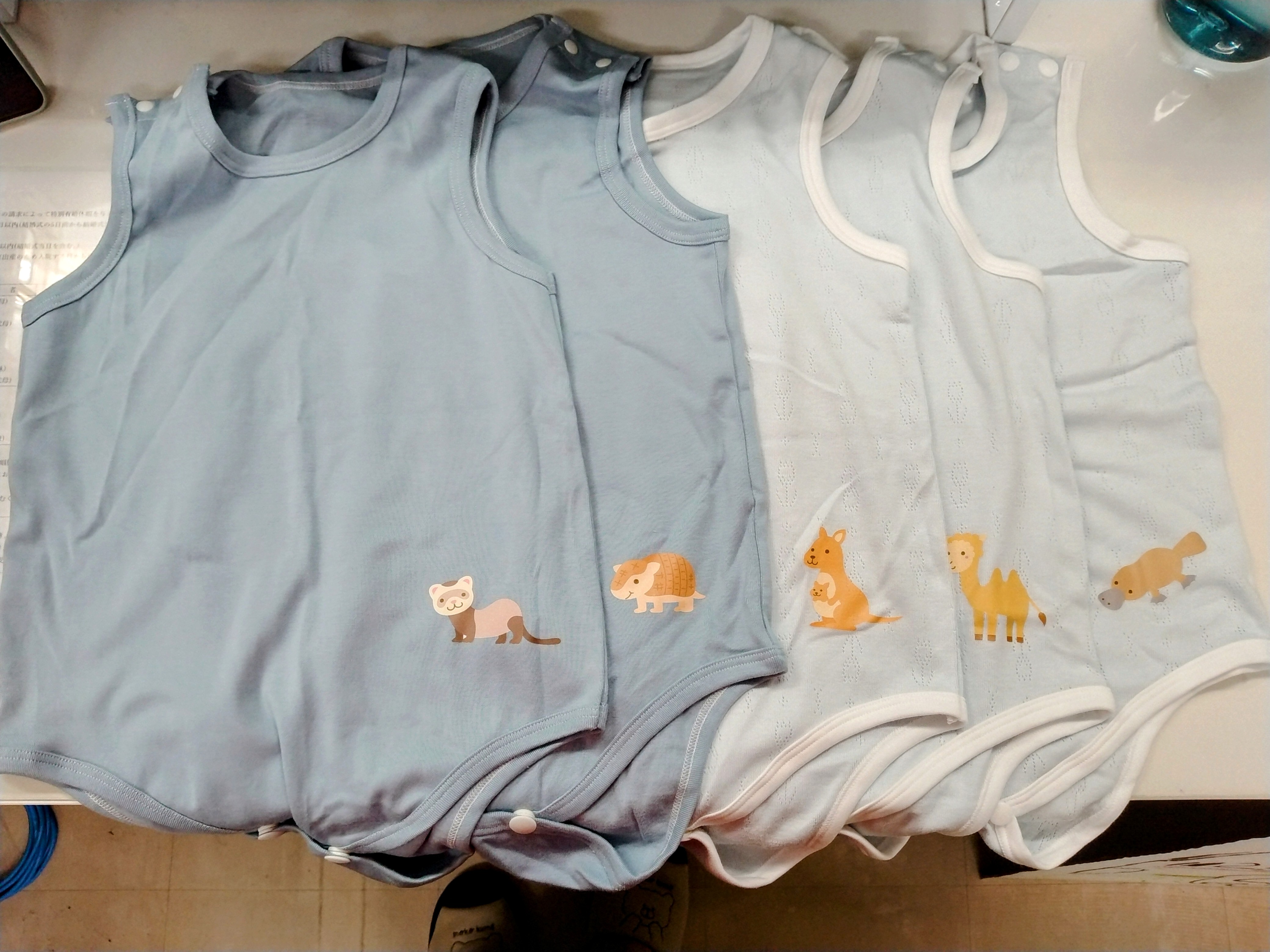 6月27日(金)手作りスタイプロジェクトの鈴木様より、股つきランニングシャツを5枚お送りいただきました。かわいいどうぶつの模様入りです。