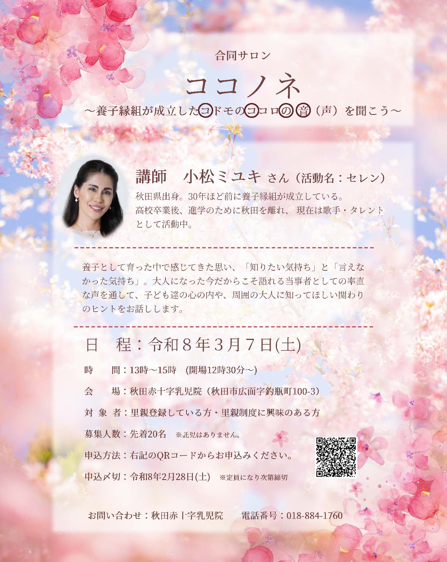 3月7日(土)13:00~15:00 秋田赤十字乳児院にて合同サロン「ココノネ」を開催いたします。 歌手・タレントとして活動中のセレンこと小松ミユキさんを講師にお招きし、養子として育った思いや、周囲の大人に知ってほしい関わりのヒントをお話いただきます。 チラシのQRコードからお申し込みください。 定員先着20名。定員になり次第締め切らせていただきます。 申込締切は2月28日(土)。 たくさんのお申し込みをお待ちしております。