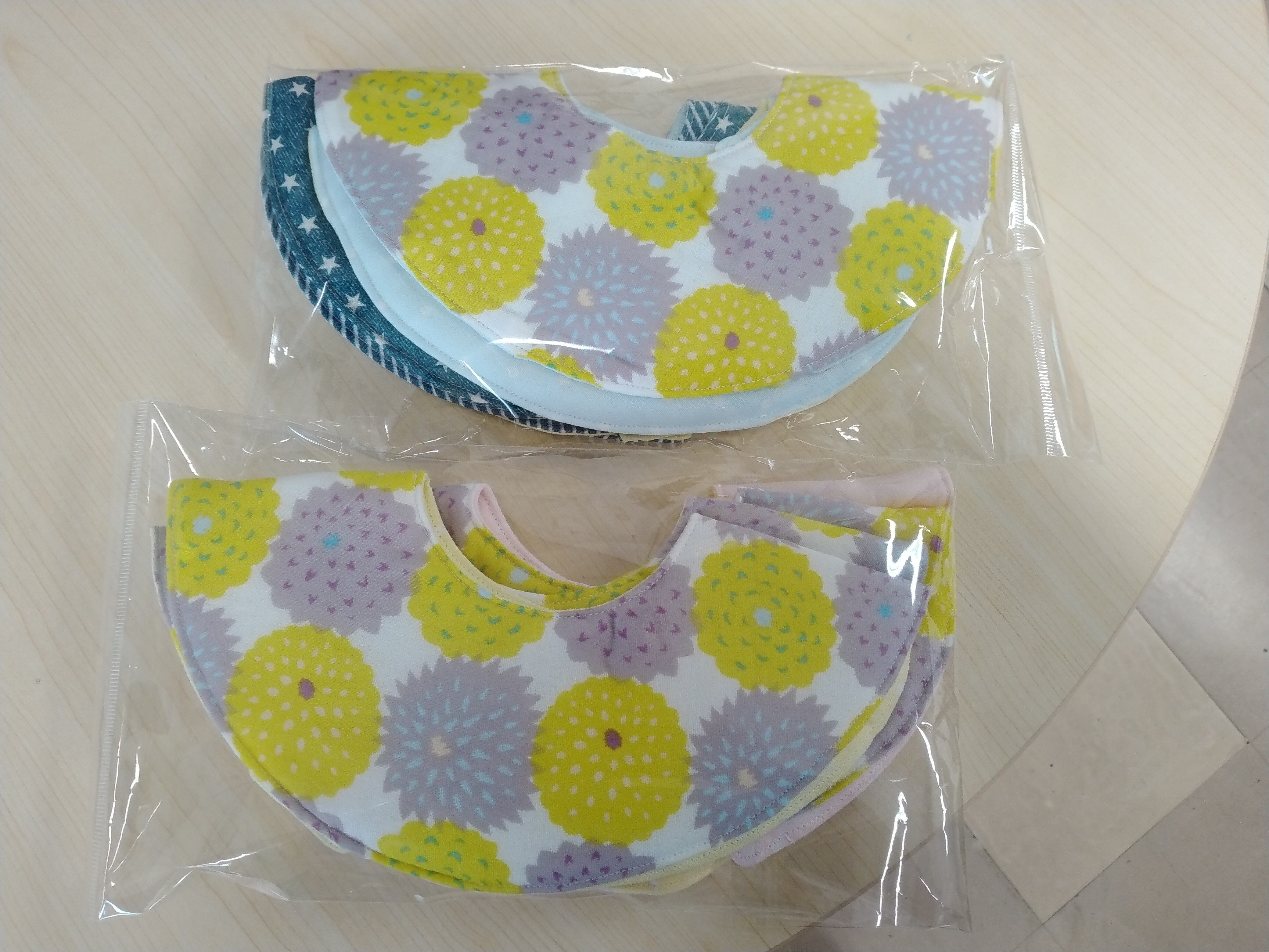 ●手作りスタイプロジェクトの石津様より、子どもたちへ円形スタイが10枚届きました。いつもと違う形なので、どうなるか楽しみです。いつもありがとうございます。