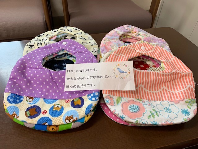 〇にかほ市にお住いの佐々木さまより子どもたちへ手作りのスタイをご寄付いただきました。