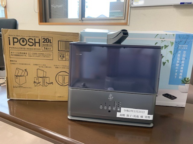 〇高階 敦子様、拓哉様より乳児院で使用しているIPOSHジアファインミスト5LとIPOSH20Lをご寄贈いただきました。