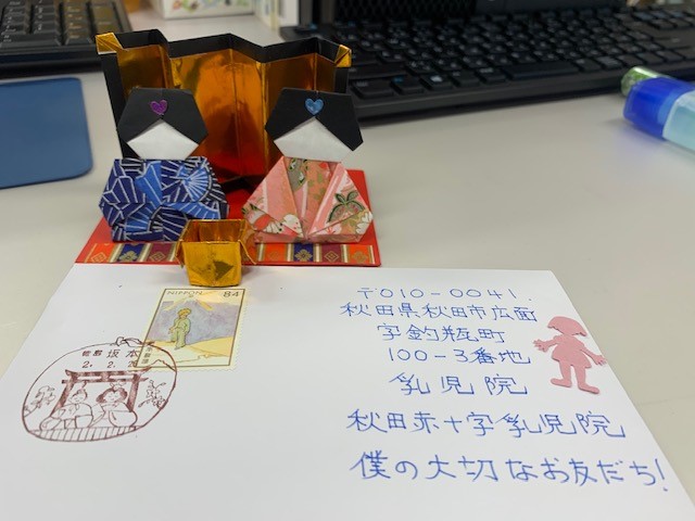 いつも、子どもたちへ季節ごとに「僕の大切なお友だち!」とメッセージカードなどを送ってくださる門司様より折り紙で作ったおひなさまが届きました。