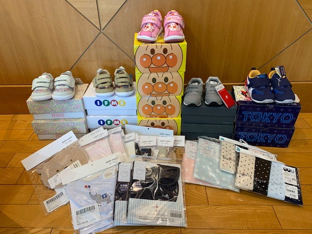 〇由利本荘市にお住いの渡辺様より子どもたちへくつとスタイなどたくさんご寄付いただきました。