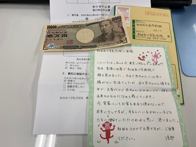 秋田市にお住いの渡部様から寄付金をいただきました。