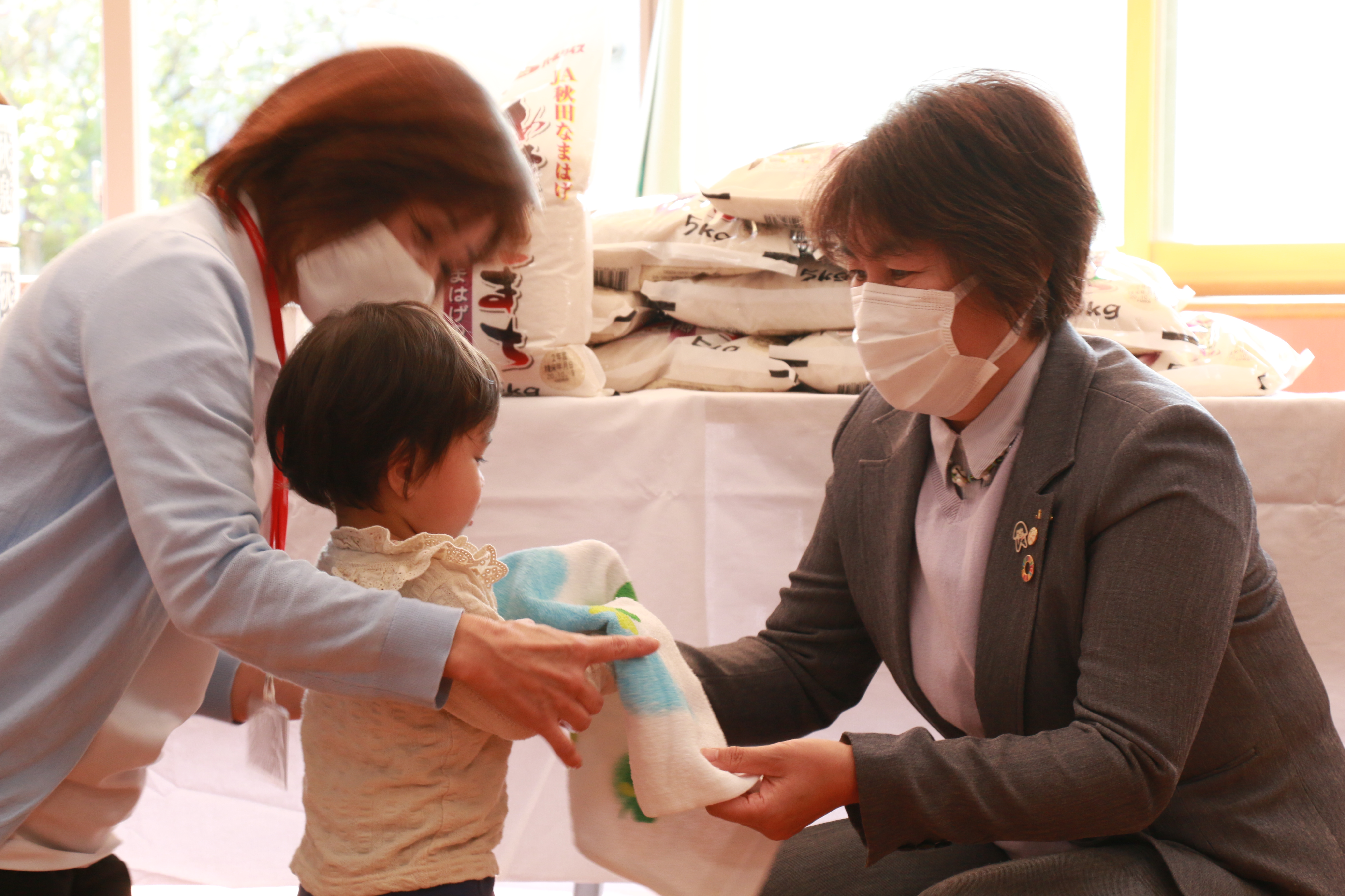 また、今年は。JA秋田なまはげ女性部の皆さんから子どもたちへ手作りタオルエプロンと手作りマスク・タオルなどたくさんご寄付いただきました。