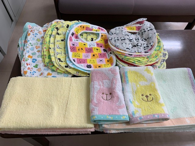 名古屋市にお住いの近藤様より、かわいい手作りスタイとタオルをたくさんご寄付いただきました。