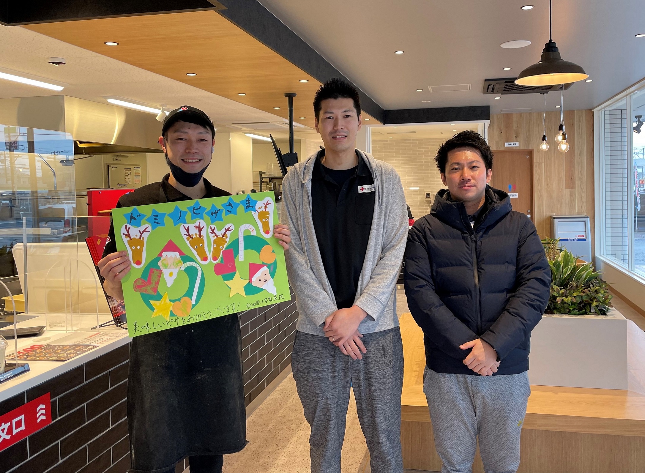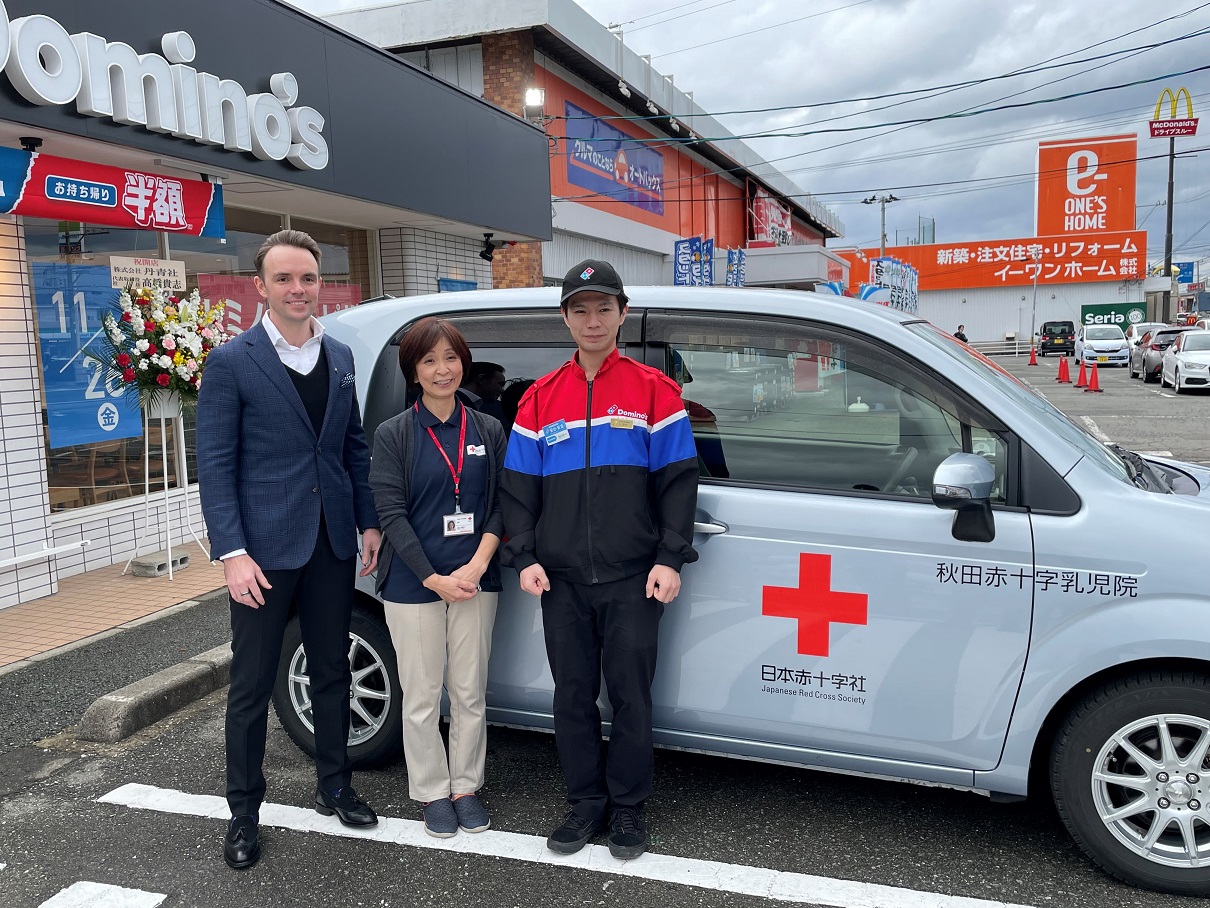 26日の「ドミノ・ピザ秋田仁井田店」オープンに先立ち、地域貢献活動「無料ピザで地域支援」として提供いただいたものです。