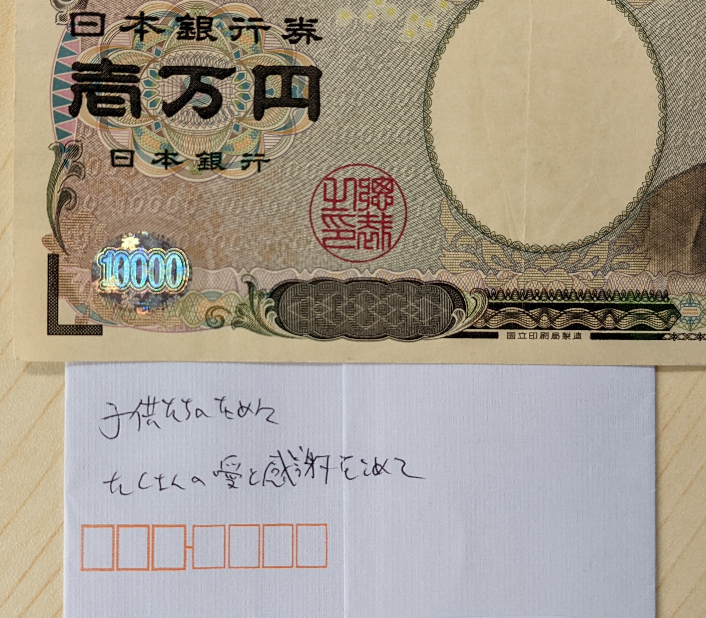 ○いつも「子供たちのためにたくさんの愛と感謝をこめて」と定期的にご寄付をいただいております、匿名希望の方から寄付金をいただきました。