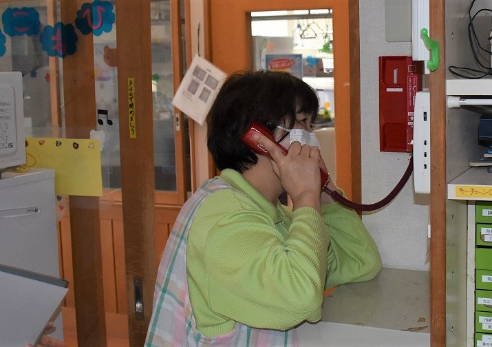<新しい受話器で消防電話対応> <火事だー!と緊迫感もって伝達>