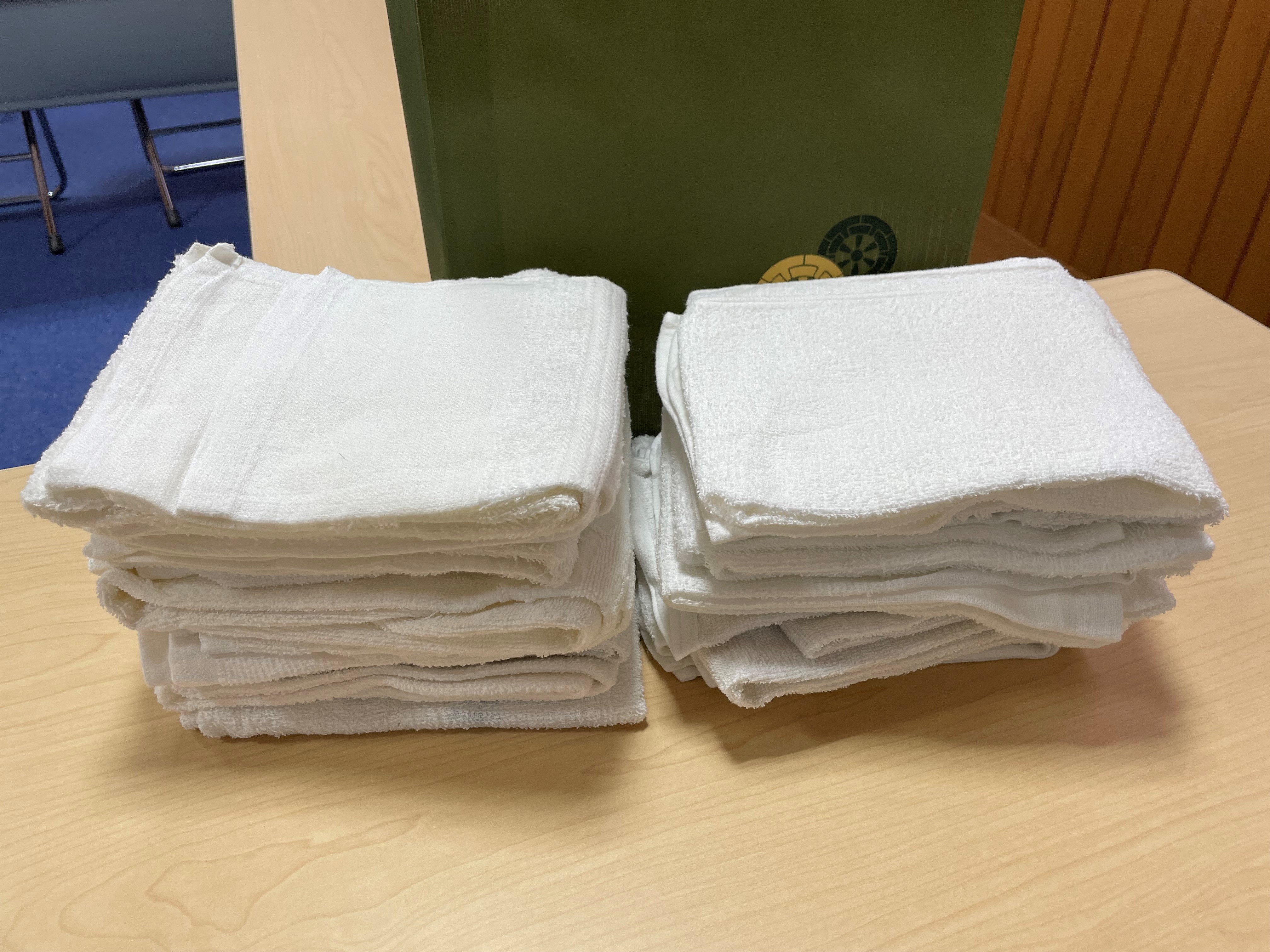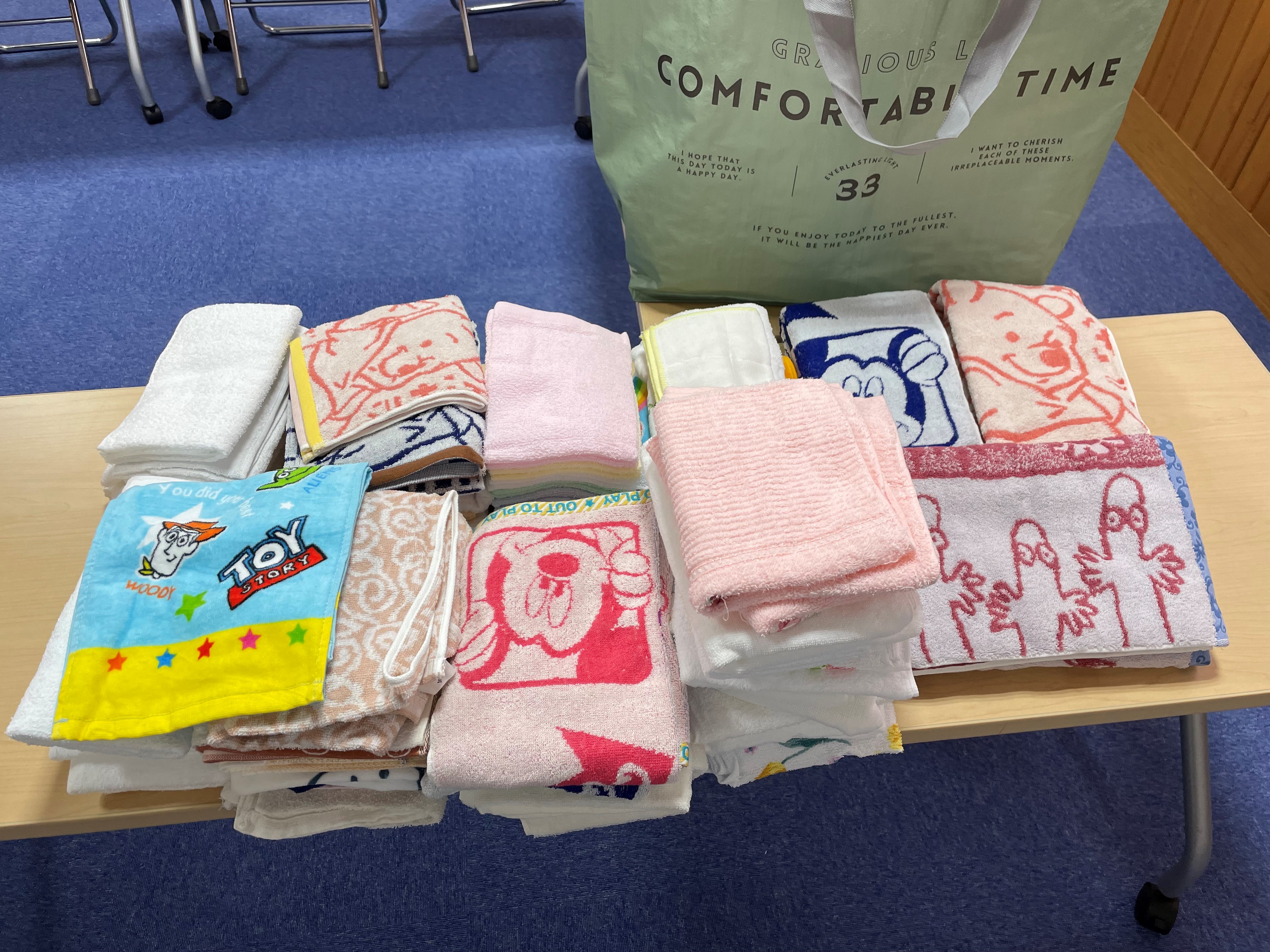 広面小学校PTAの皆様から、たくさんのタオルをご寄付いただきました。昨年もご寄付いただいております。