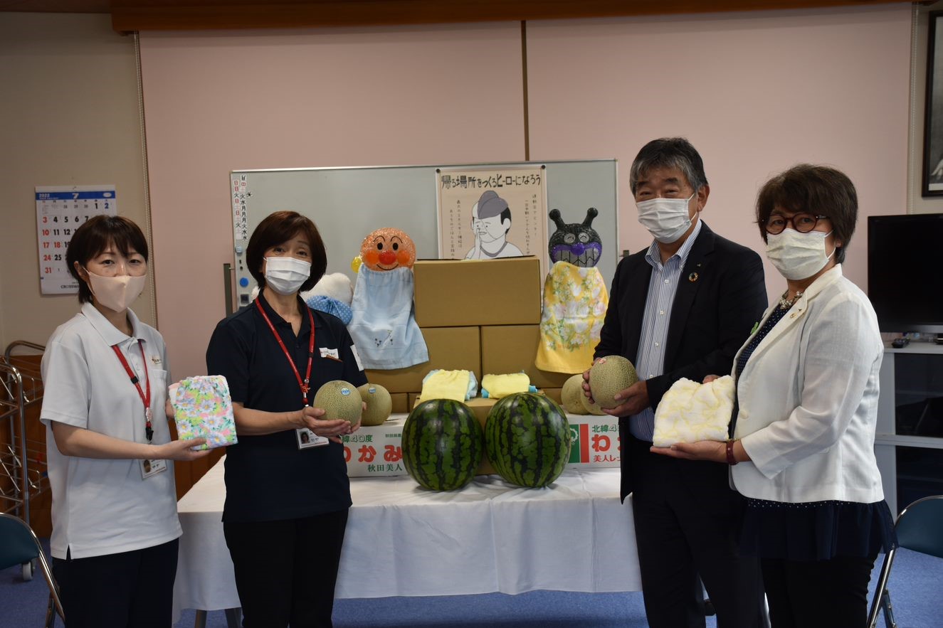 今年も、JA秋田なまはげ様より、子どもたちへすいかとメロン、そして、JA秋田なまはげ女性部の皆様からは、手作りタオルエプロンをたくさんいただきました。今年で3回目になります。