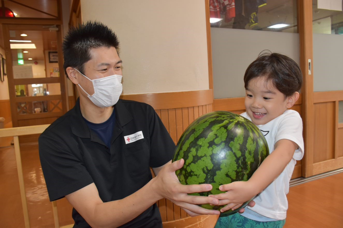 秋田市広面にあるモードヘア―フジイ様より、今年も子どもたちへ6Lサイズの大きいすいかをいただきました。モードヘア―フジイ様からは、昨年も大きいすいかをいただいております。