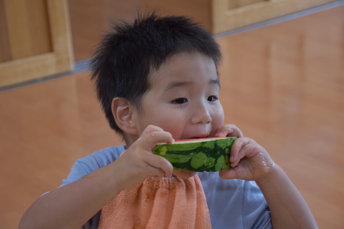 今年は、残念ながらお写真を撮る前に、子どもたちのおなかに入ってしまいました…(T_T)すみません…。子どもたちは、大きいすいかに大喜び。給食職員は、大きいすいかに悪戦苦闘した模様(;^ω^)おいしいすいかは、職員もごちそうになりました。ありがとうございました。