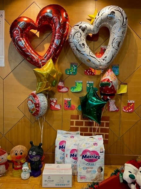 〇秋田市のバルーンギフト スパイラル様より、子どもたちへクリスマスの素敵なバルーンとオムツ、おしりふきをプレゼントいただきました。以前、ハロウィンの時にもいただいております。
