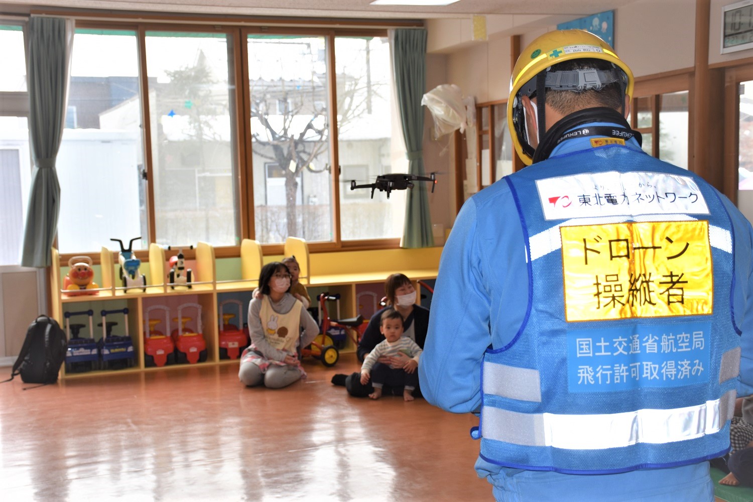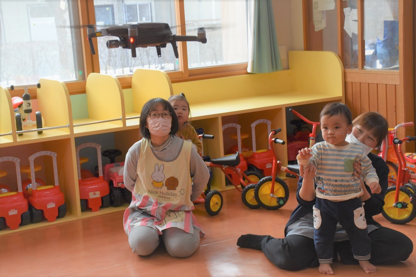 初めて見るドローンを興味津々に見つめ、動くたびに歓声があがっておりました。