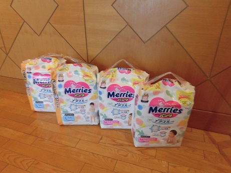 にかほ市にお住いの小松様より、子どもたちへメリーズのオムツをご寄付いただきました。