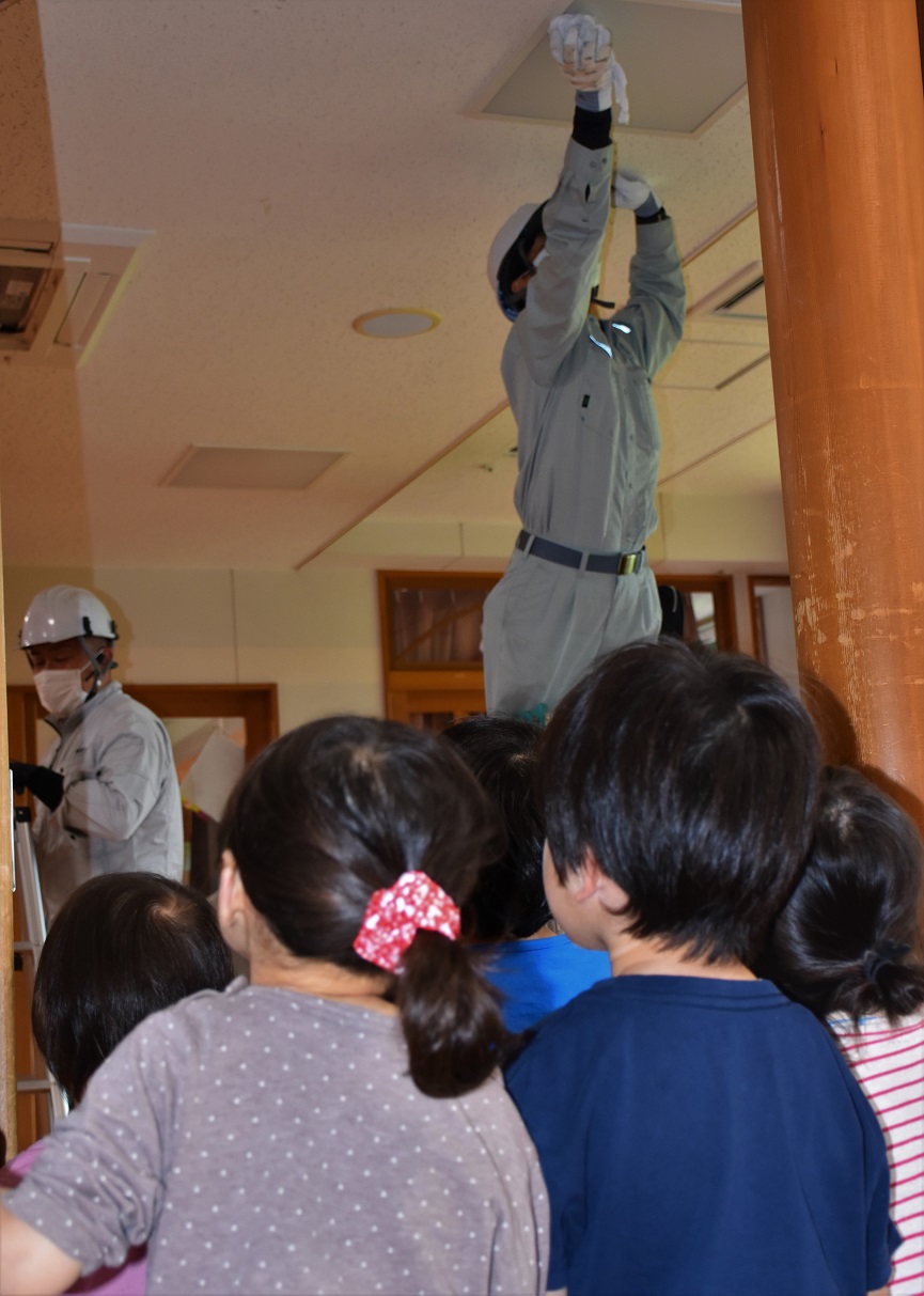 子どもたちは興味津々に見つめ、「おにいさんありがとう」「がんばれー」と声をかけ、青年部の皆さまもそれに応えながら作業いただきました。