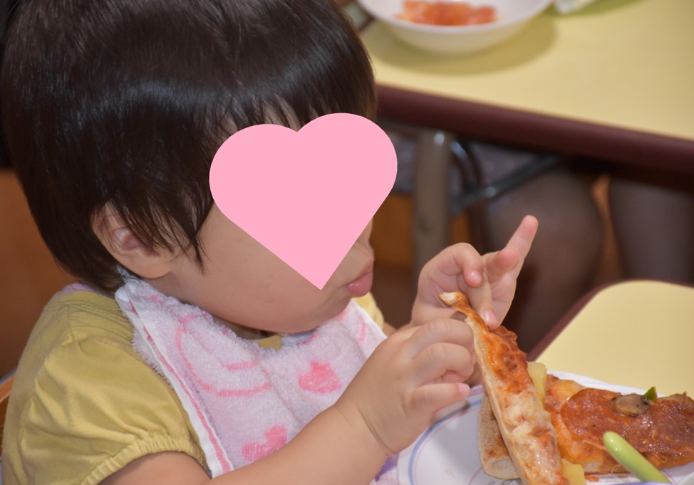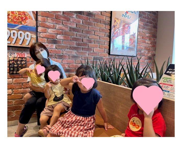 道中のトンネル内を通過する際は、「くらい!こわい~」とニコニコしながら、全然怖がっている様子はなく車に揺られていきます。ピザを持って帰って、担当の名前を呼び、「ピザ、〇〇ちゃんにあげる~」とお話をする子。鼻をホジホジする子…(;^ω^)シートベルトが気になりベルトを引っ張ろうとする子。「ピカチュウのタオルを持ってきたよ」と自慢する子。ことり組の子どもたちは個性豊かです。